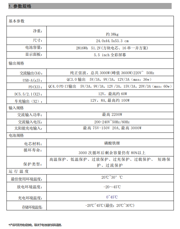 1.3000W(即3千瓦時)電池容量基本滿足家庭一天用電需求。